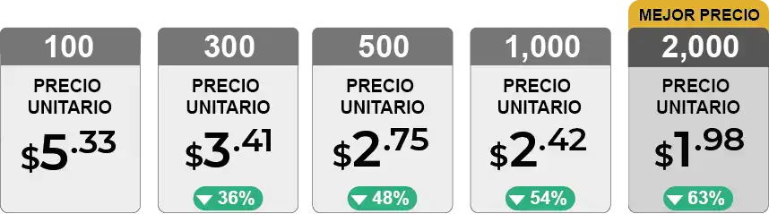 | Cantidad | 100 | 300 | 500 | 1000 | 2000 |