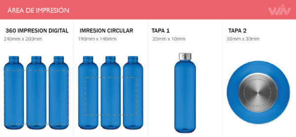 La superficie lisa y translúcida de la botella proporciona un área de marcaje ideal para logotipos, mensajes promocionales o slogans inspiradores. UTAH TOP es una herramienta eficaz para campañas de marca que buscan posicionarse en un estilo de vida activo, saludable y eco-consciente.
