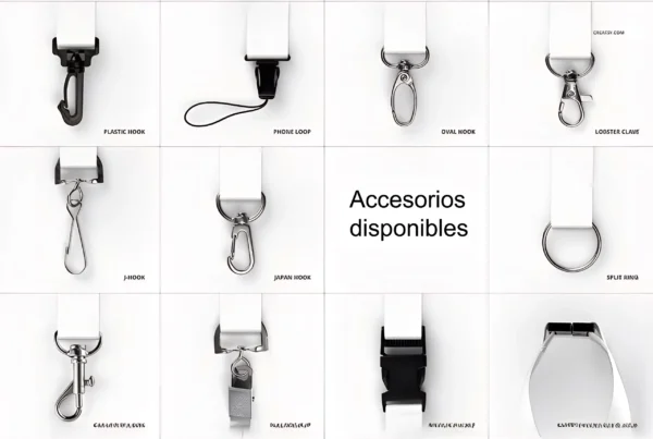 Su diseño versátil y funcional incluye un gancho metálico tipo mosquetón que facilita el enganche de credenciales, tarjetas de acceso, llaves u otros accesorios. Además, cuenta con la posibilidad de elegir entre 11 tipos de accesorios, adaptándose a diversas necesidades y configuraciones según el tipo de evento.