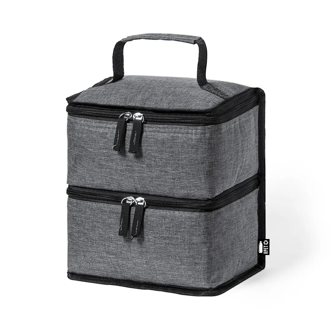 Fabricada en poliéster 600D RPET de alta calidad, proveniente del reciclaje de botellas plásticas, esta lonchera combina resistencia, funcionalidad y conciencia ambiental. Su estructura robusta incluye dos compartimentos independientes con cierre de cremallera y tiradores de tela, lo que facilita el acceso y mantiene la temperatura de los alimentos de forma óptima.