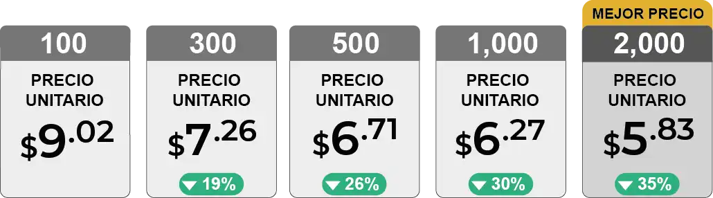 | Cantidad | 100 | 300 | 500 | 1000 | 2000 |