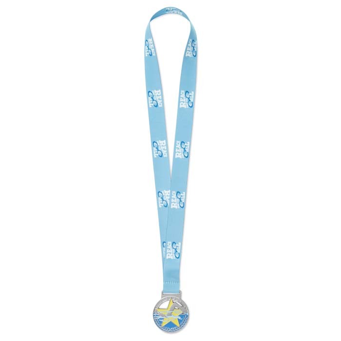 La medalla incluye cinta de poliéster, cómoda y resistente, ideal para uso en eventos deportivos o ceremonias. La cinta puede complementar el diseño general y reforzar la identidad visual del evento o marca.