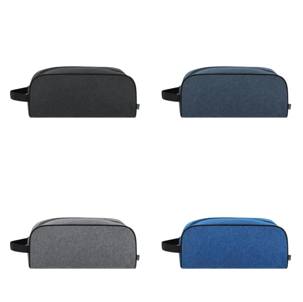 El asa lateral en color negro facilita el transporte, permitiendo llevarlo cómodamente en la mano o colgado de una maleta. Además, incluye una etiqueta visible con el distintivo RPET, que comunica de forma clara su compromiso ambiental.