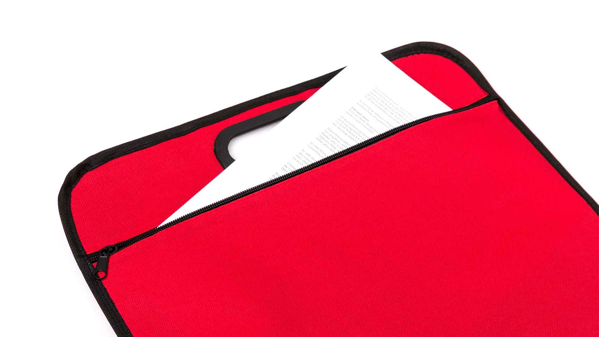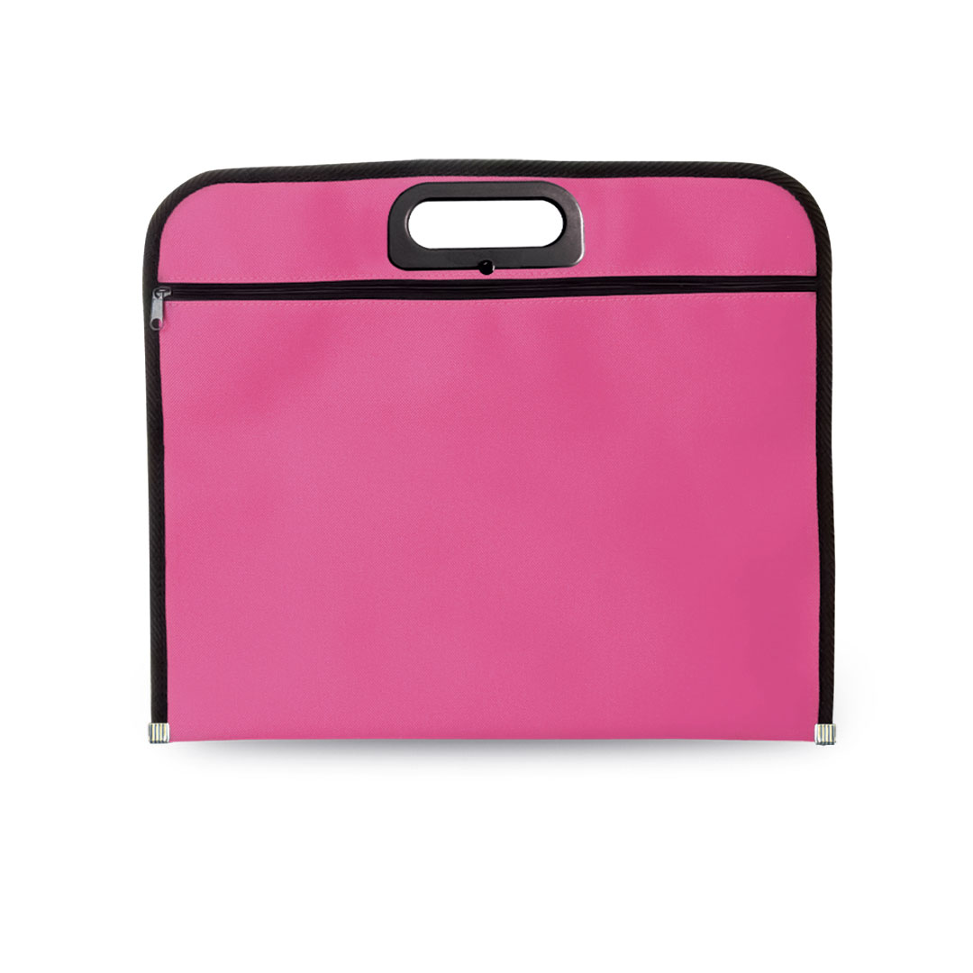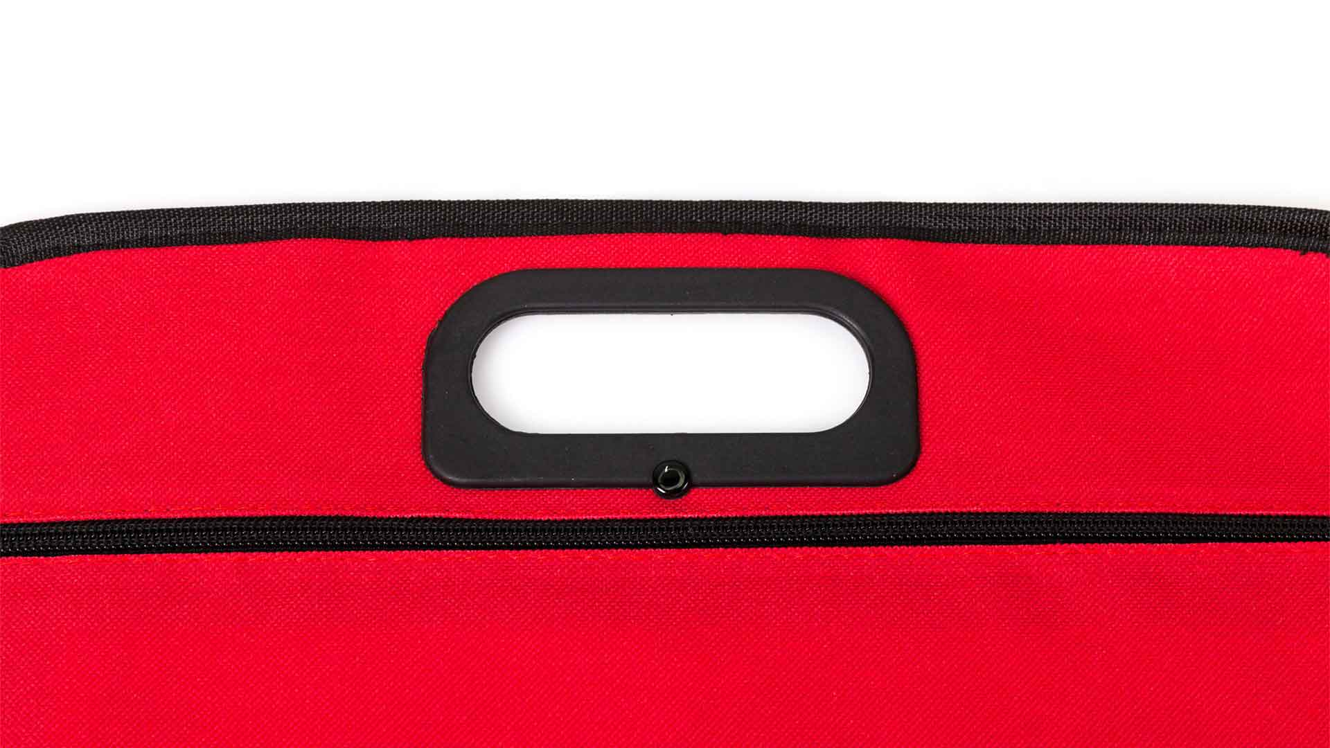Portadocumentos de cierre de cremallera en suave acabado de poliéster 600D de vivos colores. Con asas de transporte de original diseño troquelado con refuerzo.