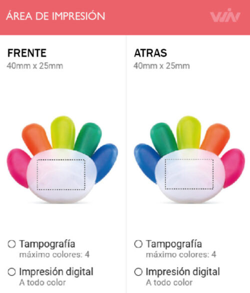Diseñado con ingenio y color, este set de marcadores en forma de mano ofrece cinco rotuladores fluorescentes integrados en una sola pieza. Cada “dedo” contiene un marcador de color distinto: azul, verde, amarillo, naranja y rosa, cubriendo las principales tonalidades para subrayar, decorar o codificar. El cuerpo blanco brillante en forma de palma proporciona una gran área para personalizar con tu logotipo.