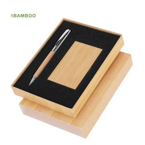 Ideal para eventos corporativos, regalos promocionales o como detalle exclusivo en conferencias, el Set de Tarjetero Jarviner es una excelente opción para quienes buscan un producto práctico y sofisticado. Este distinguido conjunto incluye un bolígrafo y un tarjetero, combinando bambú y metal en un diseño moderno y elegante que refleja la calidad y el buen gusto de tu marca.